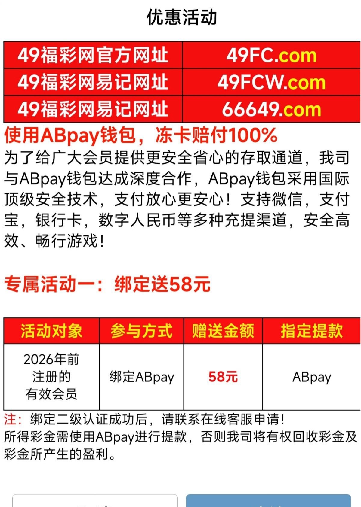 26年之前注册过福彩网有号的老用户绑定abpay钱包可以去找在线客服拿58 新用户可以碰一下新人活动 有就有没有就无视 不纠纷